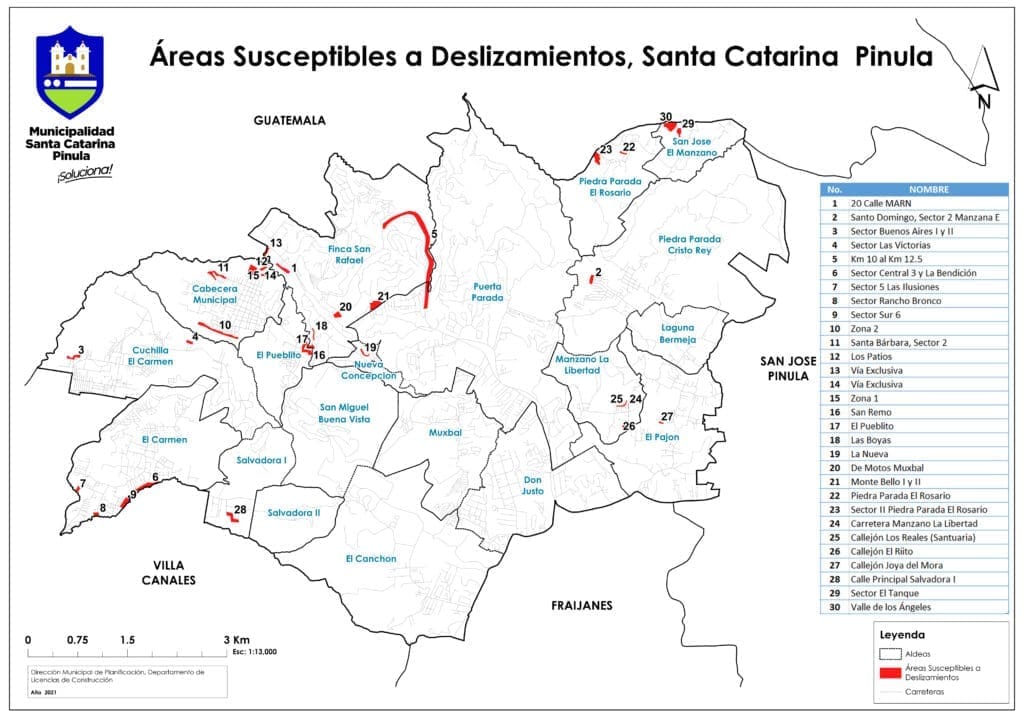 La alcaldía de Santa Catarina Pinula, Guatemala, creó la Empresa Municipal para la Vivienda (Emuvi) en 2020 con el fin de comprar terrenos a los cuales se puedan mudar quienes viven en las 48 zonas con alto riesgo ante desastres, según evaluó la Coordinadora Nacional para la Reducción de Desastres (CONRED).