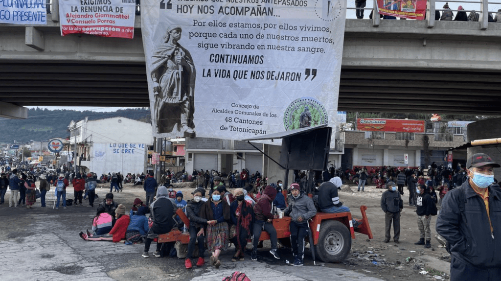 7:50 horas: Así luce Cuatro Caminos, San Cristóbal, Totonicapán. Manta colocada por el concejo de alcaldes comunales de los 48 Cantones de Totonicapán. «Continuamos la vida que nos dejaron (nuestros antepasados)».