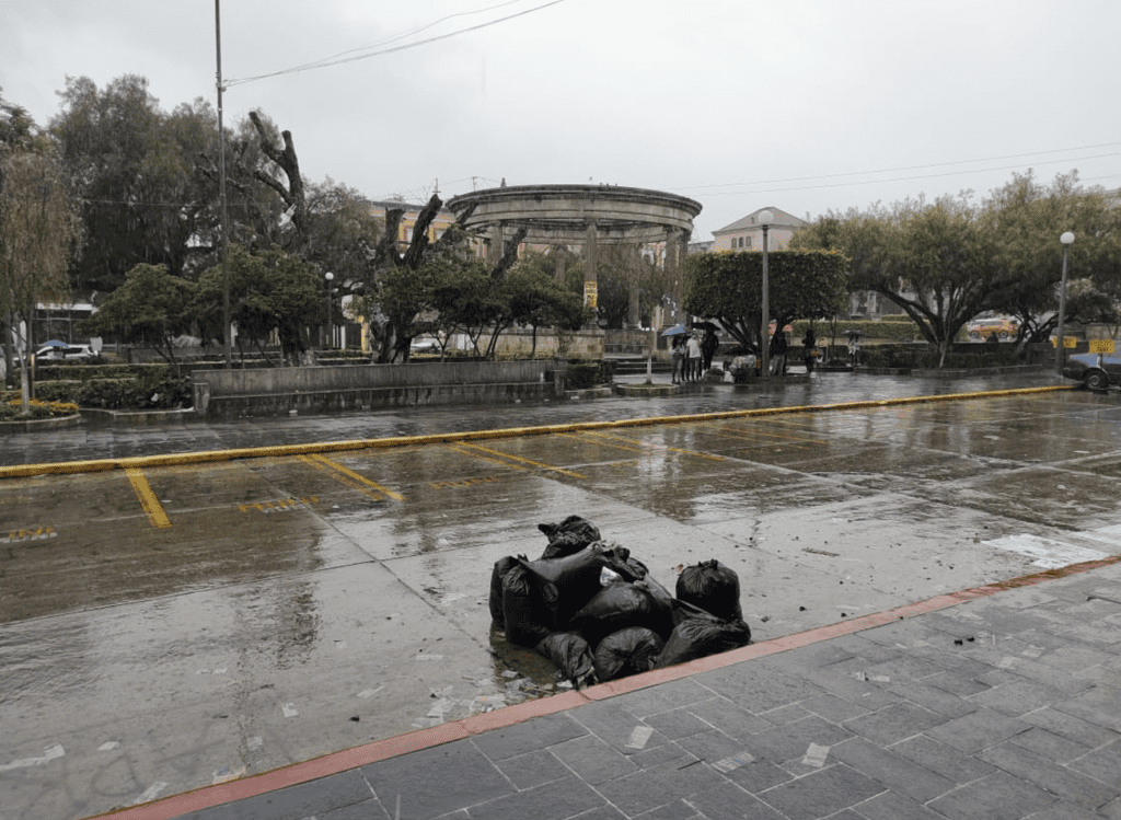 14:27: En #Quetzaltenango las personas que manifestaban se retiraron debido a la lluvia, no sin antes recoger su basura y dejarla en bolsas negras frente al edificio municipal.