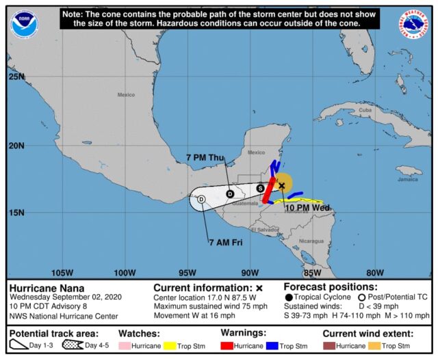 El Centro Nacional de Huracanes de Miami anticipó que la tormenta Nana alcanzaría la categoría de huracán en las próximas horas al llegar a Belice. La Conred empezó a trasladar ayuda a los albergues en Petén y Puerto Barrios, Izabal.