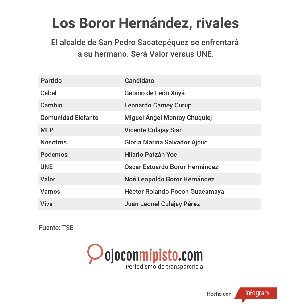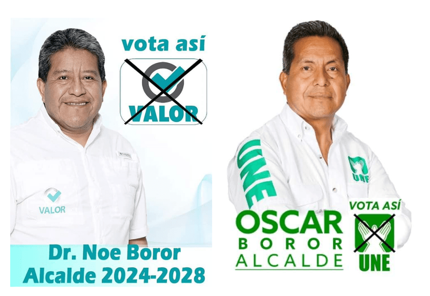 El actual alcalde Noé Leopoldo Boror Hernández ganó su primer periodo con Creo, en 2019. Ahora busca la reelección con Valor. En la contienda se enfrentará a su hermano Óscar Estuardo que participa con la UNE.
