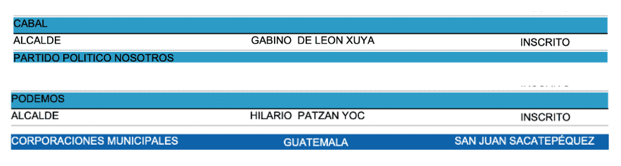 Gabino de León Xuyá fue inscrito por el partido Cabal. No es la primera vez que participa en un cargo de elección popular. En 2019 lo hizo con el partido Unionista y obtuvo 666 votos, mientras que Noé Leopoldo Boror ganó la alcaldía con 6 mil 154 votos a favor. En esa ocasión participaron cinco candidatos. En este proceso van diez.
