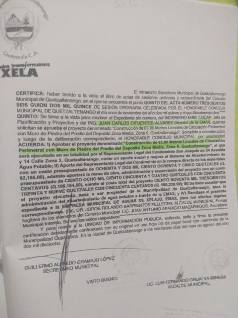Según el acta 306-2015 el 11 de noviembre de 2015, el «Honorable Concejo Municipal» aprobó por unanimidad el proyecto denominado «Construcción de 63 metros lineales de circulación perimetral con muro de piedra del predio del depósito zona media, zona 9, Quetzaltenango». Está vez la empresa, según la resolución, tendría que ejecutarlo en su totalidad, es decir, no solo entregar el material como en las dos ocasiones anteriores. Esta vez a quien le tocó contribuir fue al Condominio San Joaquín.