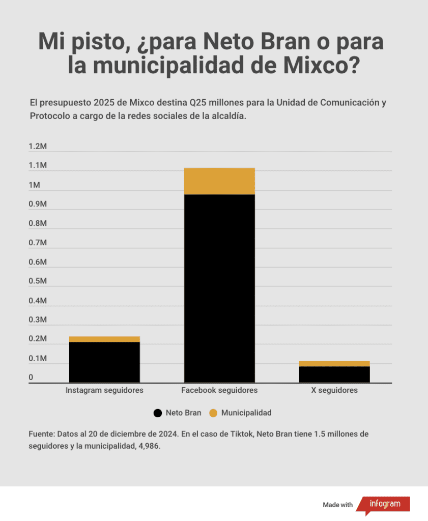 Según el alcalde, la unidad encargada de estas redes es la que recibirá Q22 millones en 2025: Comunicación social y Protocolo. Cinco millones más que en 2024 y con 41 personas a cargo de promover su imagen y la de su administración.