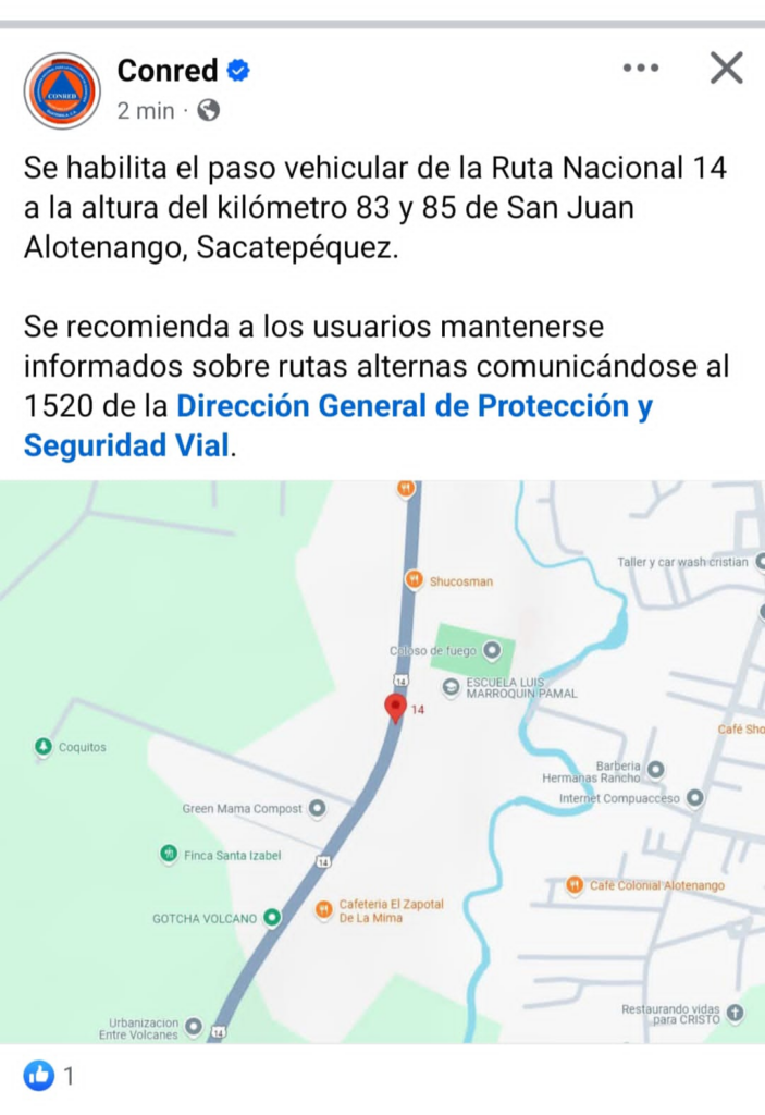 No se invirtió fondos en tema de construcción. Para 2025, según el Portal de Gobiernos Locales, la comuna designó Q15 mil para prevención de desastres y calamidades públicas. En cuanto a la Ruta Nacional 14 (RN-14), fue habilitada a medio día de este lunes. Durante la erupción la mantuvieron cerrada.