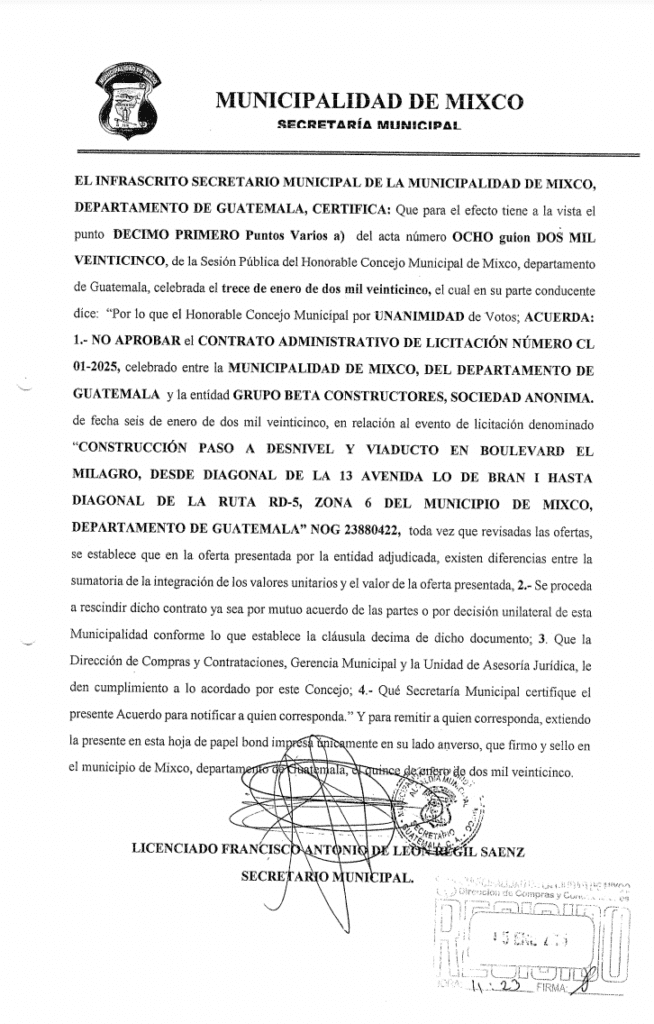 La obra de Q65 millones y el contrato fueron rechazados luego de que el concejo encontrara “diferencias entre la sumatoria de la integración de los valores unitarios y el valor de la oferta presentada”. Esta fue la segunda licitación de la comuna para este proyecto.