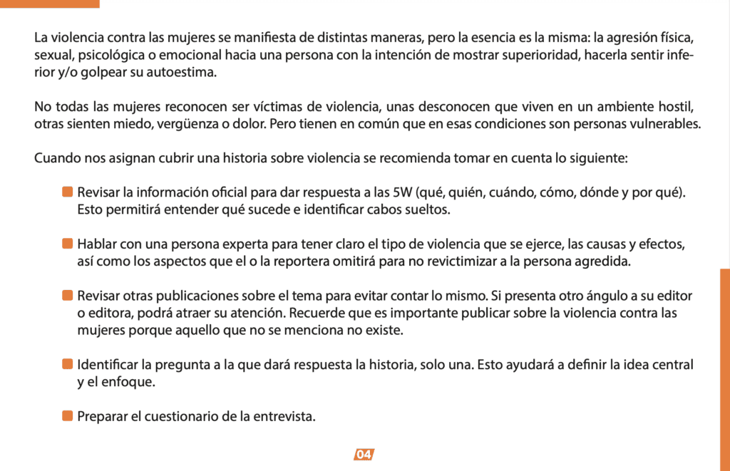 El primer apartado hace referencia a la estructura de la nota, enumera recomendaciones como hablar con especialistas para identificar el tipo de violencia y qué evitar para no revictimizar a la persona agredida. Asimismo, los aspectos a tomar en cuenta al momento de escribir como desechar la narrativa que hace alusión a crímenes pasionales, desobediencia o celos.