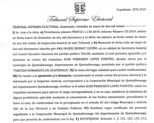 El 8 de mayo de 2018 el partido Valor denunció ante la Inspección General del Tribunal Supremo Electoral (TSE) investigar la inscripción de Juan Fernando López Fuentes como candidato a la alcaldía de Quetzaltenango. El jueves 20 de febrero les respondió: el concejo municipal debe resolver si el ahora alcalde reúne todos los requisito para ejercer el cargo.