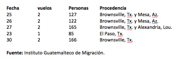 De acuerdo con el Instituto Guatemalteco de Migración la semana pasada ingresaron siete vuelos con guatemaltecos deportados procedentes de Estados Unidos. Este lunes 30 de marzo entraron otros dos con 166 personas de Brownsville, Texas. De México vía terrestres ingresaron, solo en marzo, 1,719 guatemaltecos deportados.