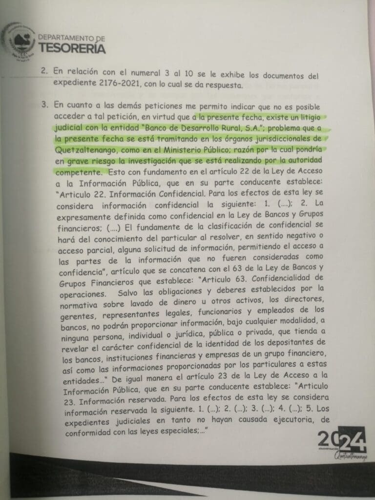 “No es posible acceder a tal petición, en virtud que a la presente fecha, existe un litigio judicial con la entidad Banco de Desarrollo Rural S. A.” ,respondieron.