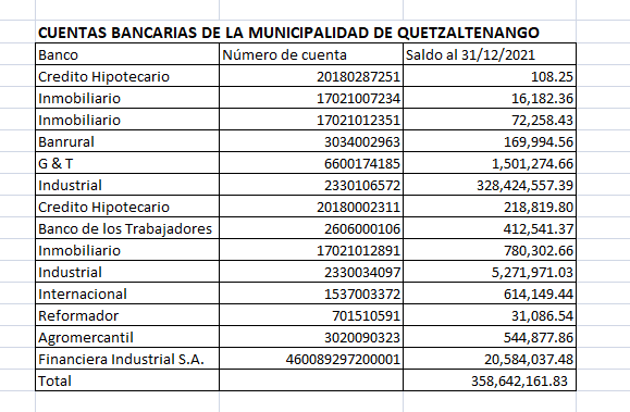 Hasta el 31 de diciembre de 2021, la comuna tenía Q358 millones 642 mil 161.83 repartidos en 14 cuentas bancarias, la mayoría, Q328 millones están en el Banco Industrial y Q20 millones más en la Financiera Industrial S.A.