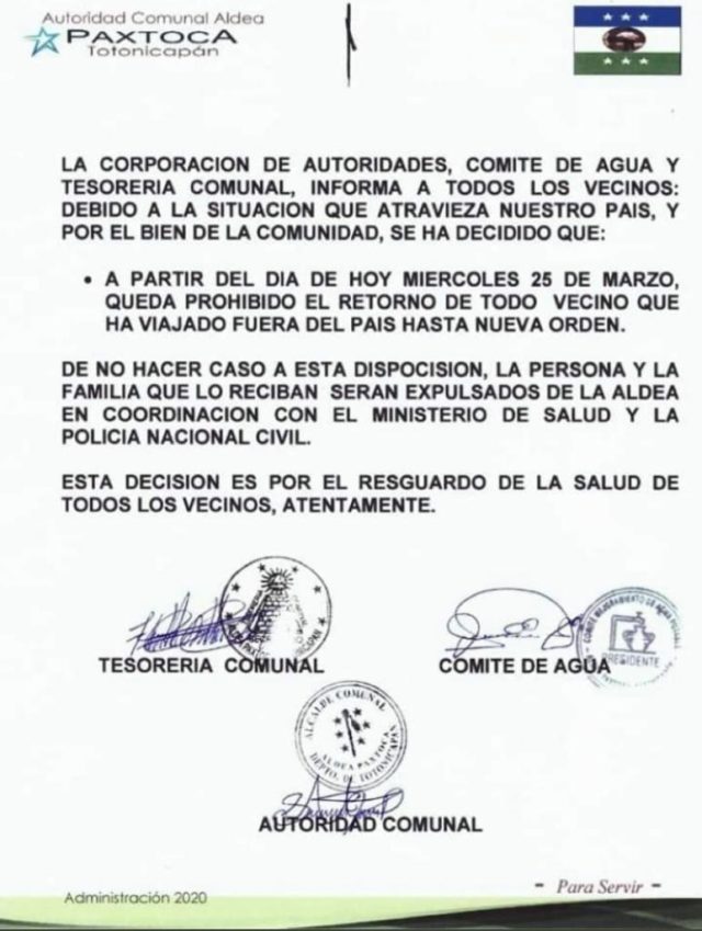 En Paxtocá, las autoridades acataron las instrucciones presidenciales del 16 de marzo cuando comenzaron las restricciones de movilidad y suspensión de clases y labores. También cumplieron con el toque de queda del 22 de marzo. Sin embargo, durante esos días 12 personas deportadas de Estados Unidos llegaron a la aldea con la recomendación de hacer cuarentena domiciliar. Pero, según el alcalde, ellos no lo cumplían y esto motivó la publicación del comunicado que prohibía la entrada de viajeros a Paxtocá.
