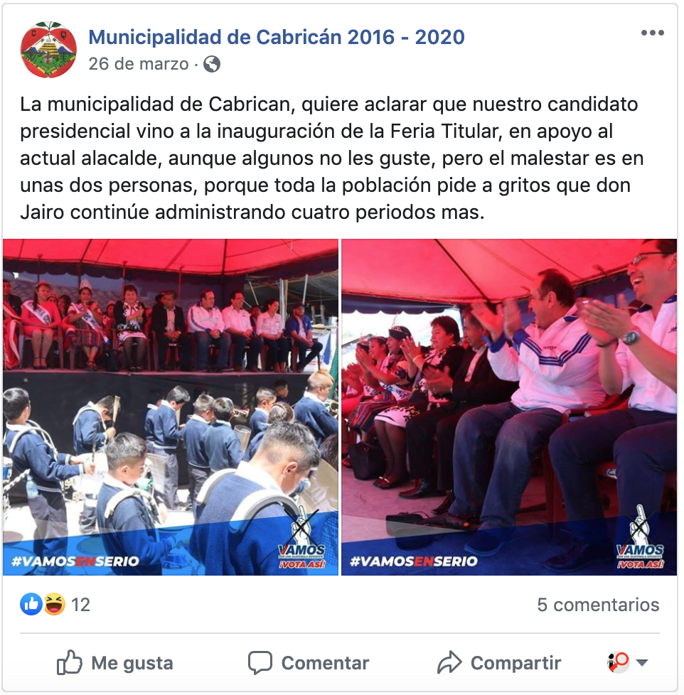 Jayro Guillermo López Ramírez solo logrará terminar un periodo en la municipalidad de Cabricán. Su partido “Vamos” perdió las elecciones municipales al solo obtener el 24.76 por ciento de los votos. Lo superó el candidato de la UNE, Eleazar Esaú López y López. Este último también participó en las elecciones de 2015, con Líder.