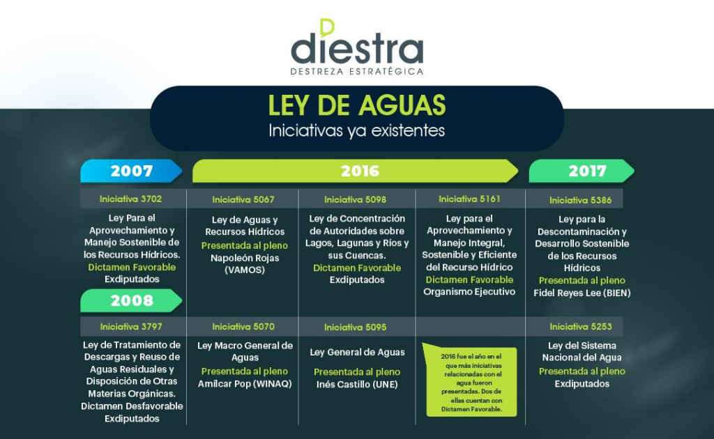 De 1991 a la fecha se presentaron más de 10 iniciativas, ninguna ha sido aprobada. Guatemala es uno de dos países de Centroamérica sin una Ley de Aguas para gestionar el recurso.