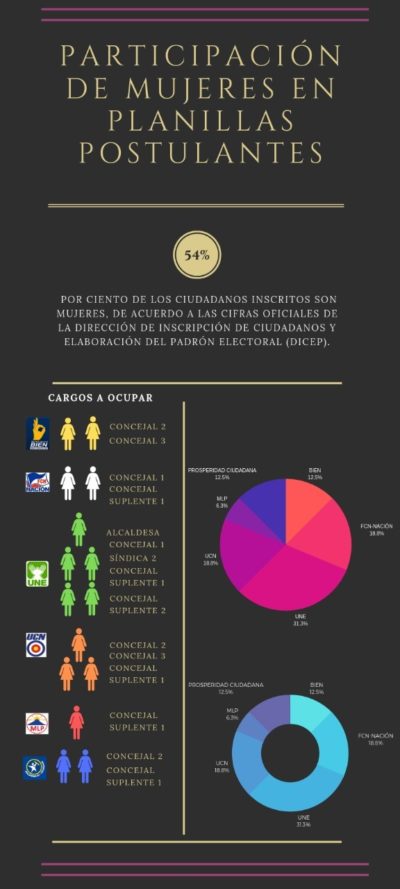 El padrón electoral indica que hay un electorado de 6,218 mujeres y 5,315 hombres. “Ha sido de años la poca participación de las mujeres, a pesar de su inteligencia y talento no tienen el valor de participar”, comenta Aneth Sagastume, subdelegada municipal de TSE desde el año 1993.