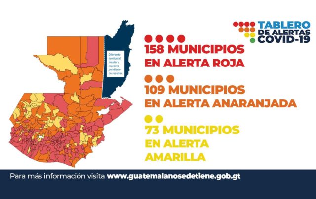 El ministerio de Salud (MSPAS) cambió en los últimos días los parámetros para catalogar que 158 municipios están en alerta roja, 109 en naranja y 73, amarilla. No hay ninguno en verde por ahora, con lo cual en ninguna región reanudaron todas las actividades.