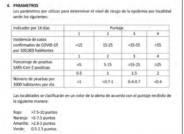 El porcentaje de positividad del 34.7 por ciento y la tasa de pruebas de 0.05 fueron también determinantes para la categoría que Salud le asignó. Este cálculo se realiza por tres puntuaciones que se suman y así determinar la alerta.