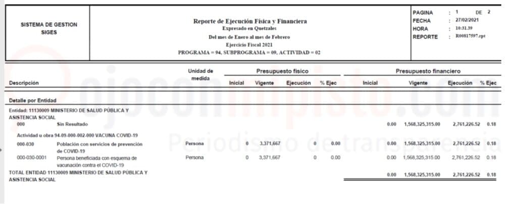 Esta cantidad la pudo corroborar Ojoconmipisto en Siges y Sicoin, dos portales de contabilidad del Estado que registran cómo se ejecutan los Q1 mil 500 millones (decreto 1-2021) que el Congreso aprobó para la compra de la vacuna anti-Covid19.