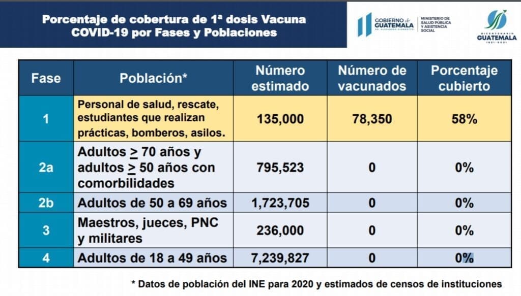 La salida que encontró el Gobierno para empezar a inocular al personal médico fueron dos donativos de Israel e India que sumaron 205 mil dosis, y un primer lote de 80 mil 600 más que costaron Q2.7 millones del mecanismo COVAX de la Organización Mundial de la Salud (OMS-OPS). En esta plataforma se busca cubrir a otras 2.2 millones personas.