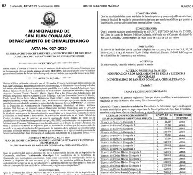 En el acta 27-2020, el concejo municipal de San Juan Comalapa, Chimaltenango, acordó modificar su tabla de tasas y licencias municipales, el cobro que hacen las comunas por establecer un negocio y mantenerlo. Eso fue en mayo. Meses después, el 27 de octubre, también modificó el reglamento del mercado municipal, piso de plaza y estacionamiento vehicular. Ambas con el fin de modernizar el servicio para el portal de Gobiernos Locales (GL), dijeron.