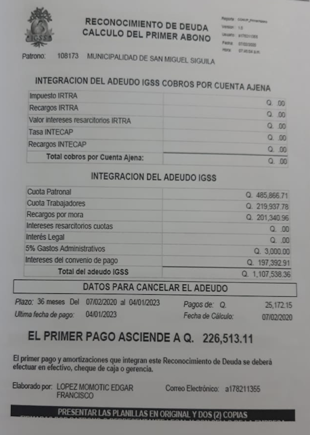 El alcalde Aníbal Vicente Díaz, que asumió la dirección de la municipalidad de San Miguel Siguilá, Quetzaltenango, el pasado 15 de enero, debió suscribir un convenio de pago con el Instituto Guatemalteco de Seguridad Social por Q1,107,536.36 por las cuotas patronales que no se han pagado desde 2015.