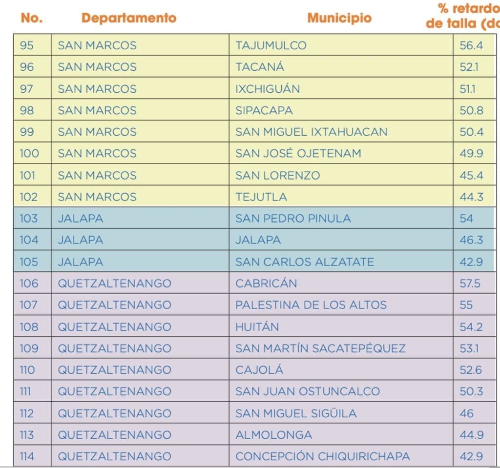 Este es uno de los tres municipios de Jalapa priorizados por la Gran Cruzada Nacional por la Nutrición. Al hacer la clasificación, 54 de cada 100 niños presentaban un retardo en la talla. Hasta el 9 de septiembre de 2023, el ministerio de Salud reportó 52 casos de desnutrición aguda en menores de cinco años.