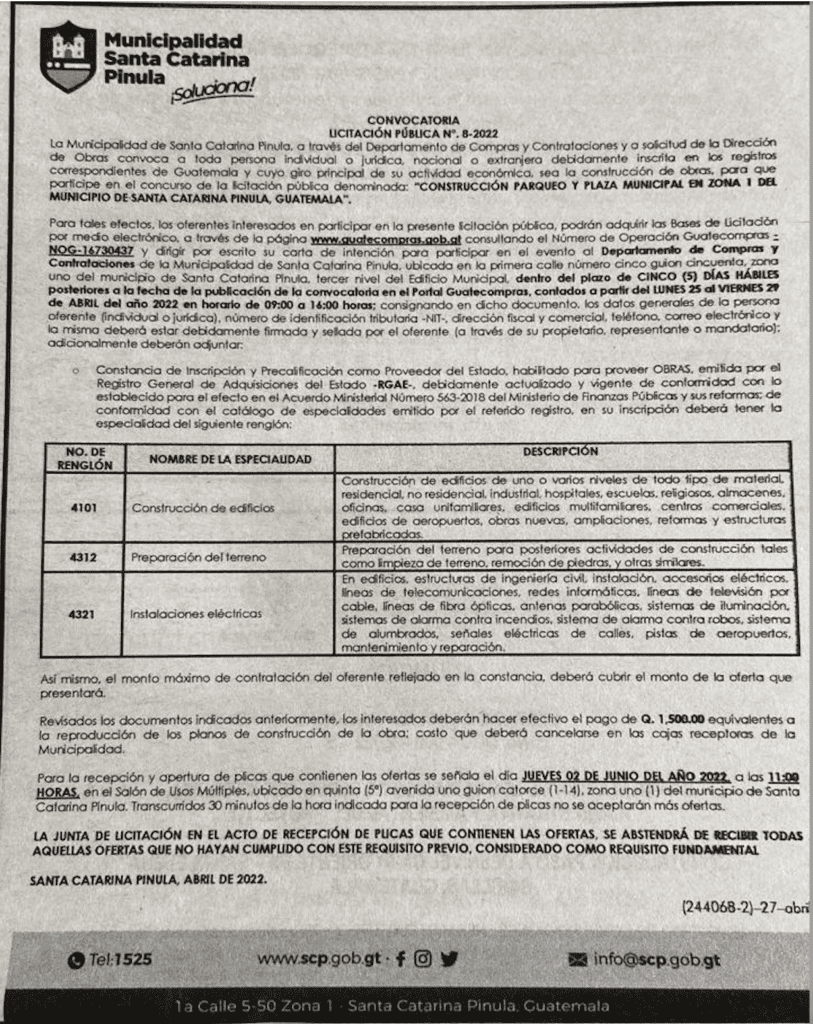 El 27 de abril el diario de Centroamérica publicó sus anuncios habituales: acuerdos gubernativos, decretos y una nueva convocatoria por parte de la municipalidad de Santa Catarina Pinula, Guatemala. Invita a las constructoras a enviar sus propuestas para construir un nuevo edificio municipal para evitar ventas informales en la calle.