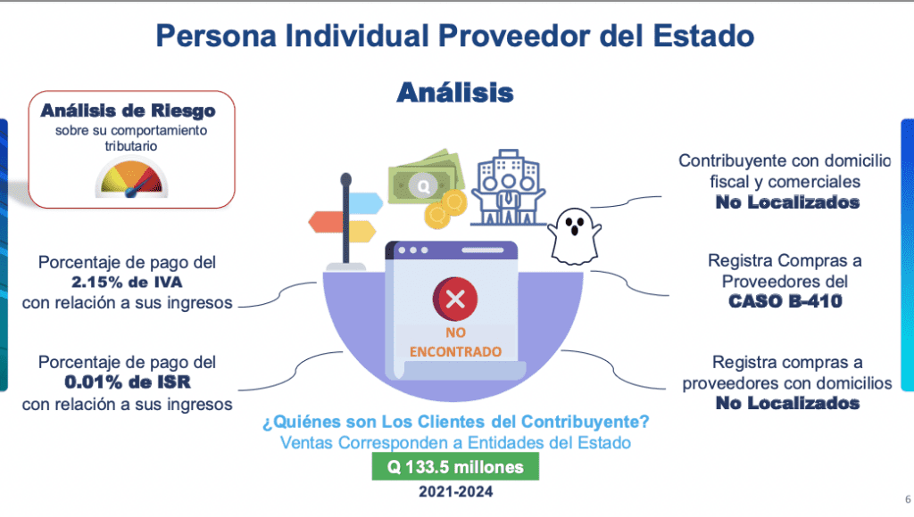 El posible fraude al fisco fue cometido por un proveedor individual, quien según los registros de la SAT compró Q2.9 millones a empresas del caso B410. La institución reportó defraudación fiscal por parte de estas entidades en agosto. No se nombró a la persona implicada.