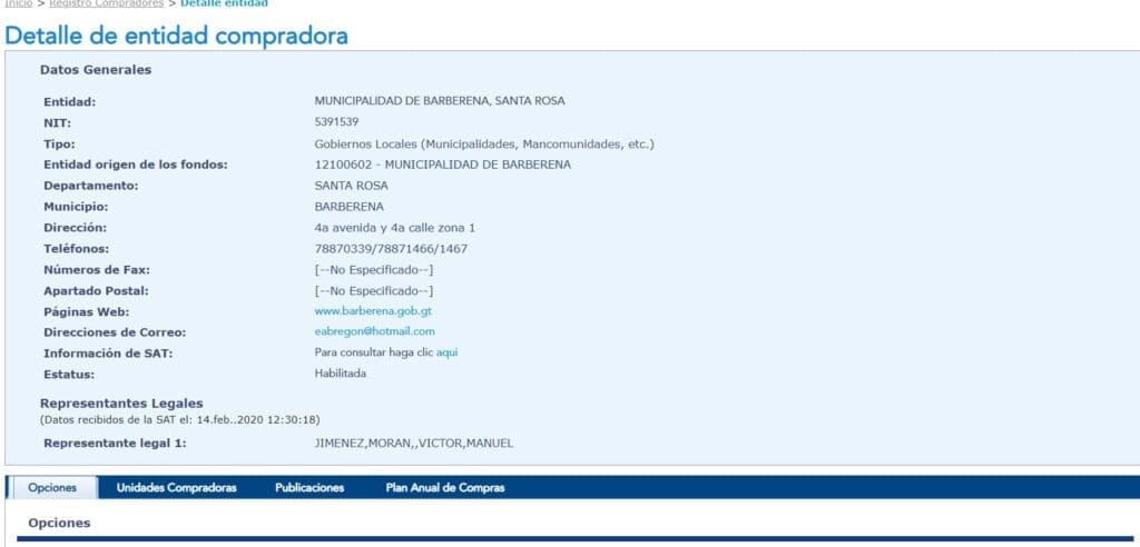 En la municipalidad de Barberena, Santa Rosa, el alcalde es Rubelio Recinos Corea desde el 14 de enero 2020. Pero en Guatecompras, el portal donde registra sus adquisiciones públicas, el representante legal aún es Víctor Manuel Jiménez Morán, el anterior jefe edil (2016-2020).