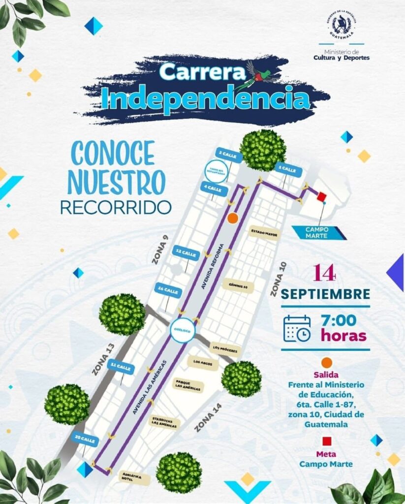 A estas actividades se suma la Carrera de Independencia entre la Avenida de Las Américas y Avenida Reforma el domingo 14 de septiembre a partir de las 7:00 horas. La municipalidad de Guatemala cubrirá puntos colindantes para establecer corredores vehiculares en Aguilar Batres y ruta al Pacífico, en la Calzada Roosevelt y el área limítrofe con Mixco y entre la 20 calle zona 10 y Santa Catarina Pinula, confirmó Montejo.