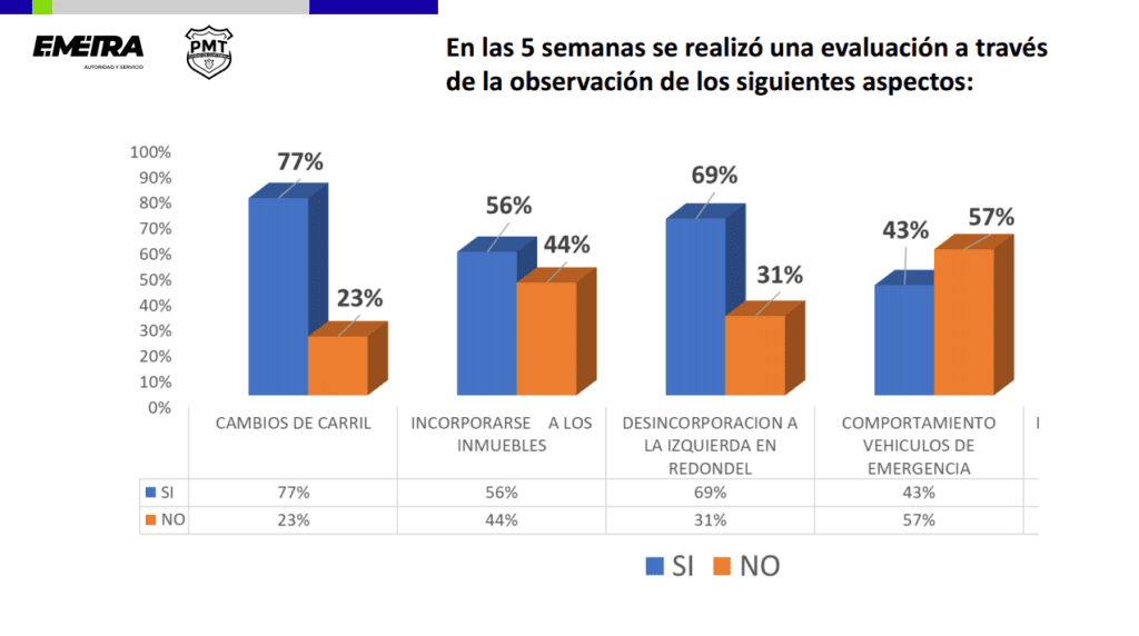 En las cinco semanas del proyecto, Emetra reportó un total de cinco accidentes y cero atropellos en el tramo intervenido. Esto representa un 61.53% menos de accidentes registrados. Con respecto a las infracciones de invasión a banquetas bajaron 65%, con un total de 11.