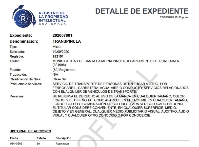 Según Luis Fernando Bermejo, abogado especialista en propiedad intelectual, se debe tomar en cuenta que «Transpinula» es una marca propiedad de la municipalidad de Santa Catarina, como consta en el Registro de la Propiedad Intelectual.