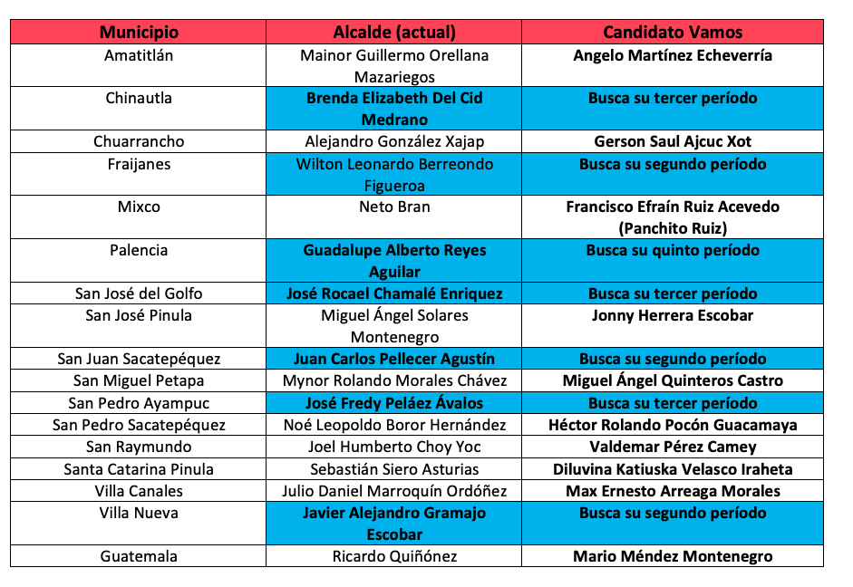 Los y las jefes ediles de Chinautla, Fraijanes, Palencia, San José del Golfo, San Juan Sacatepéquez, San Pedro Ayampuc y Villa Nueva participarán con Vamos. El resto, con otros partidos.