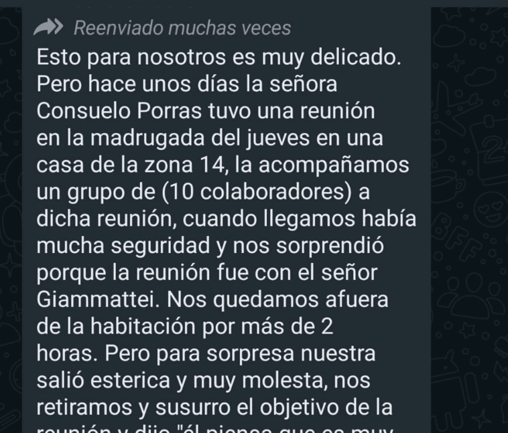 Por ejemplo, circuló un mensaje sobre una supuesta reunión entre la fiscal general y jefa del Ministerio Público, Consuelo Porras, y el presidente Alejandro Giammattei. Lo que destacó era el ícono de muchas veces reenviado, por lo cual no se supo nunca la fuente original del mismo.