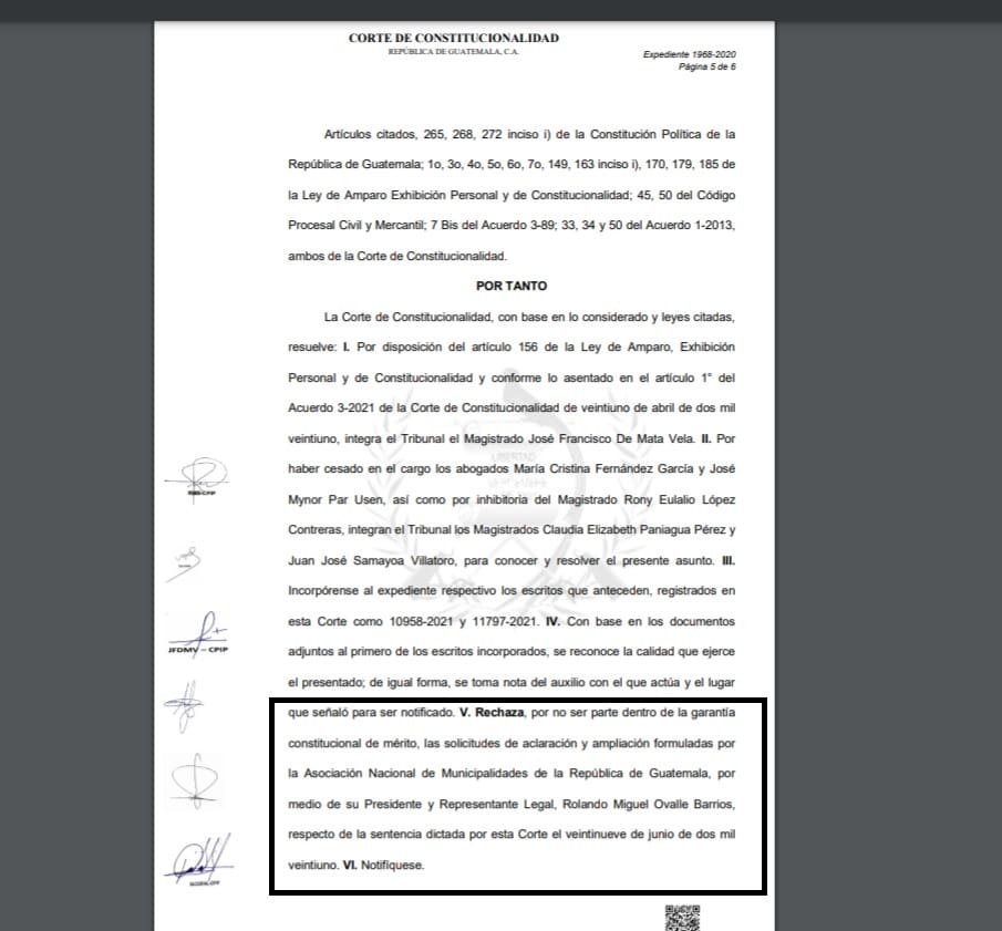 Los magistrados Roberto Molina Barreto, Dina Ochoa Escribá, José Francisco de mata Vela, Nester Vásquez Pimentel, Claudia Paniagua Pérez, Juan Samayoa Villatoro y Leyla Lemus Arriaga rechazaron en tres ocasiones estas solicitudes entre el 9 y 10 de septiembre, ya que la entidad gremial no figura como parte del proceso. Con esta postura coincide Aizenstad.