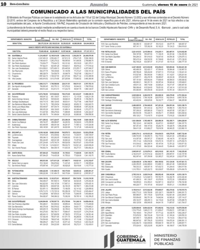 Lo asignado se publicó el viernes 15 de enero en el Diario de Centroamérica. La distribución general para las 340 municipalidades no cambiará, pero sí la que recibirá cada una.