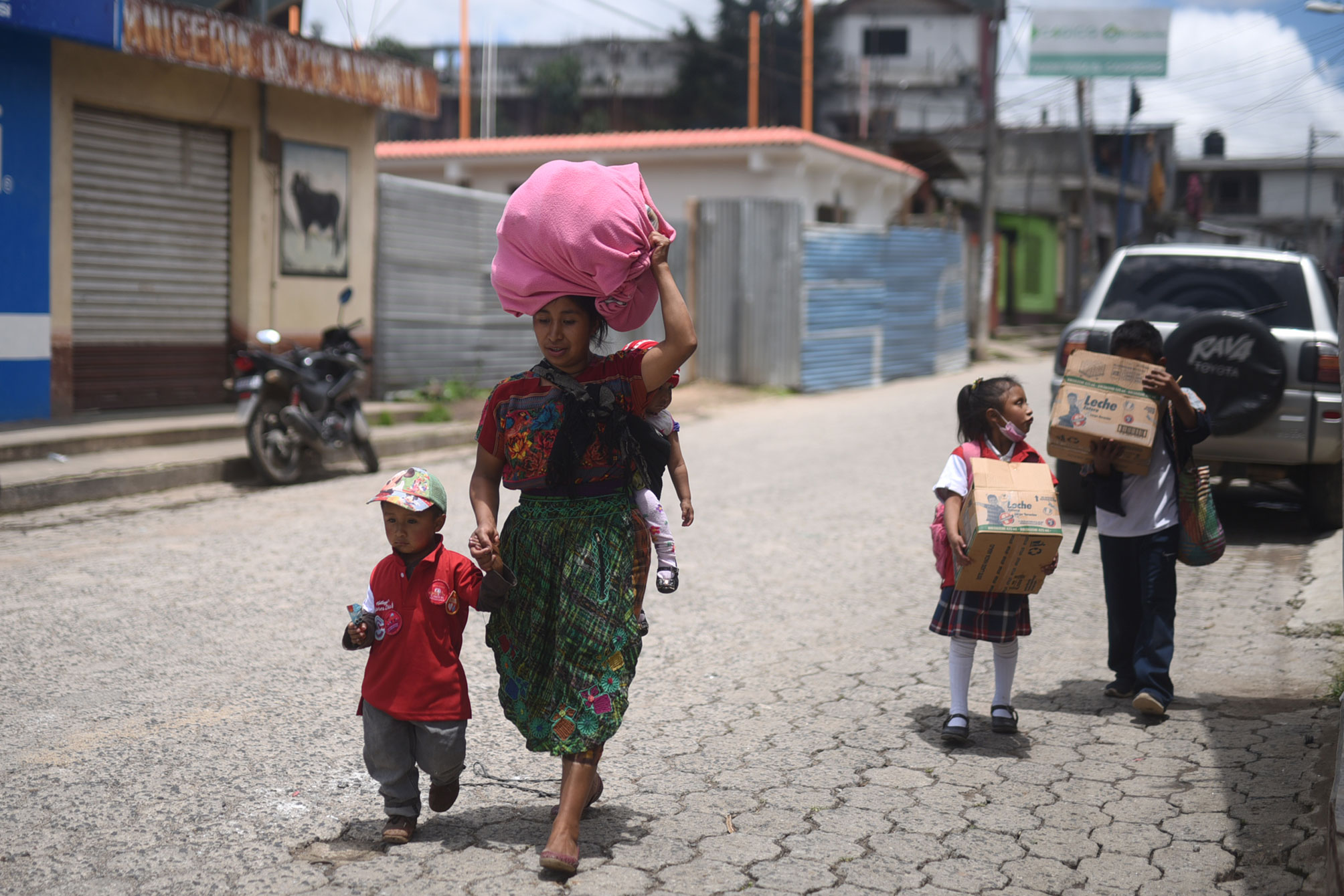 En el salón municipal, un jueves de septiembre, se entregan alimentos a los pobladores. Ahí está Mayelí Robledo, de cuatro años y medio. Su mamá la lleva “a tuto”, cargada sobre sus hombros. La pequeña nació con hidrocefalia, lo cual le dificulta alimentarse. Y padece de desnutrición crónica desde que tiene un año.