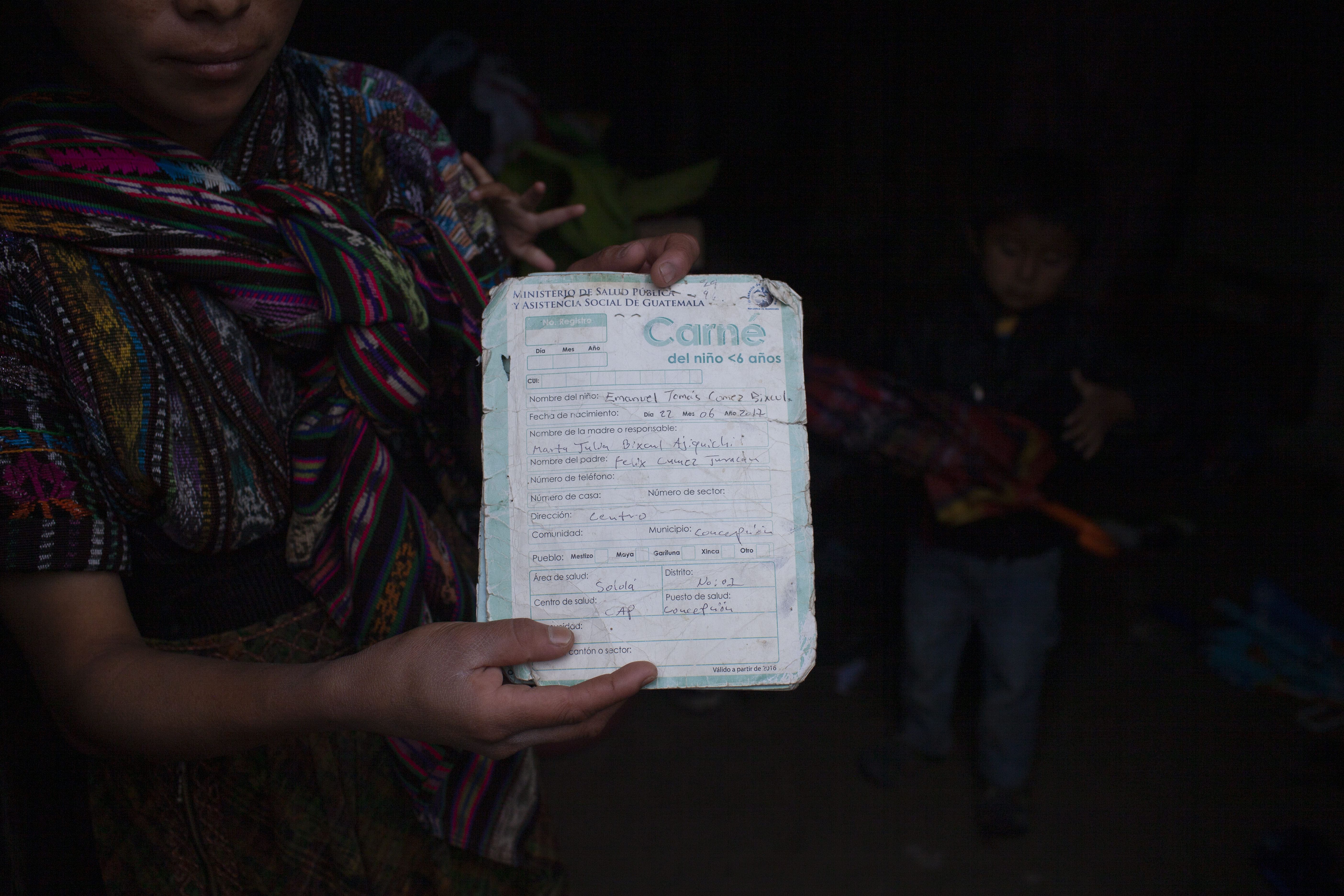 El carnet de Tomás Gómez Bixcul lleva el registro de las vacunas y los controles médicos. El niño tiene cinco años y está desnutrido. Foto: Sandra Sebastián.