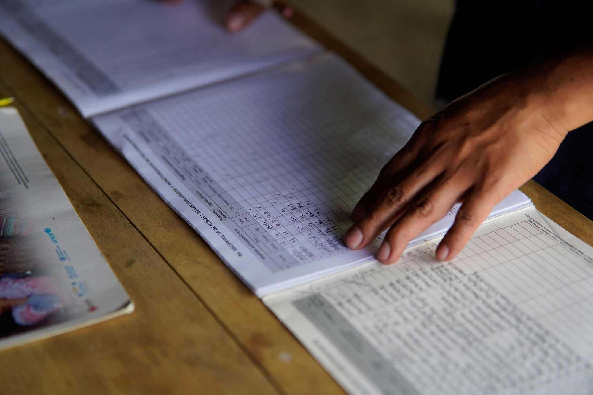 El personal de salud tiene un cuaderno donde lleva el registro del peso y talla de las niñas y niños que se recuperan de la desnutrición.