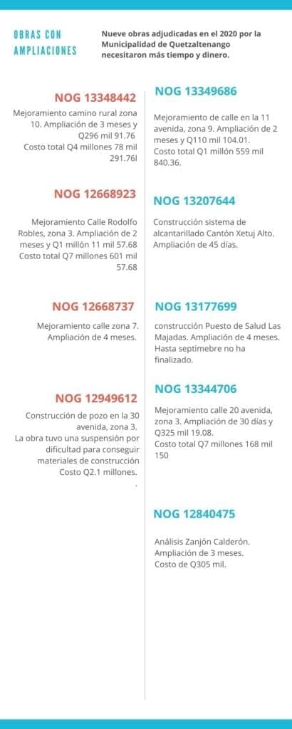 En la cabecera de Quetzaltenango, los ejecutores de nueve proyectos en marcha solicitaron más tiempo para concluirlos. Algunos, además, ampliar los recursos porque lo asignado no alcanzó. Una de esas obras presentó defectos a los pocos días de su inauguración.
