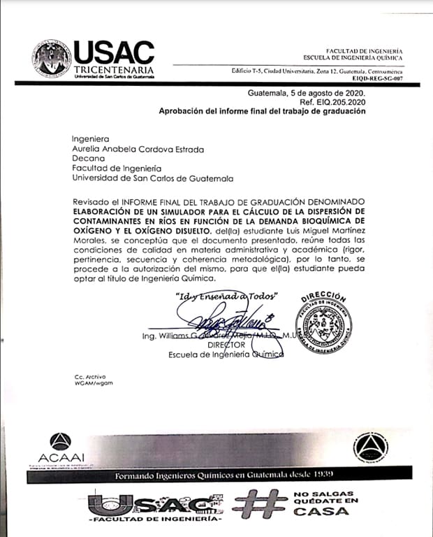 Antes de comenzar con el trabajo de graduación, los estudiantes deben escribir un informe preliminar llamado «protocolo de trabajo de graduación». Este debe ser evaluado y aprobado por una persona nombrada por la dirección de la carrera o la coordinación de área. En este caso, fue la Dirección de la Escuela de Ingeniería Química quien designó a Jorge Mario Estrada Asturias.