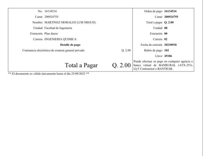 La entrevista con el exfuncionario se realizó el pasado lunes 18 de septiembre alrededor del mediodía. Horas más tarde, llamó para ofrecer la constancia del privado. Minutos después de esa llamada, envió una boleta de pago de Q2 para examen privado con sus datos de registro en la Usac.