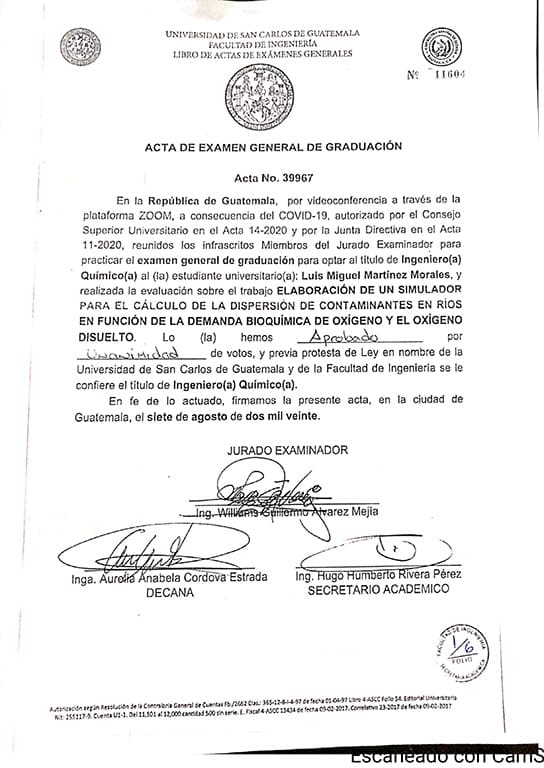 Los integrantes de ese tribunal fueron la exdecana de la Facultad de Ingeniería, Aurelia Anabela Córdova Estrada; el director de la Escuela de Ingeniería Química, Williams Guillermo Álvarez Mejía; y el secretario académico de la Facultad de Ingeniería, Hugo Humbero Rivera Pérez.