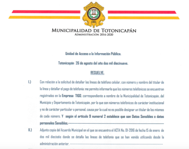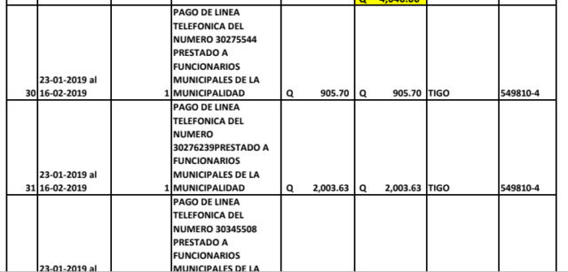 La municipalidad de Totonicapán paga el servicio de telefonía a su corporación municipal. A través de una solicitud por acceso a la información se obtuvo descripción de las facturas, y aunque están en el renglón de compras directas no aparecen en Guatecompras.