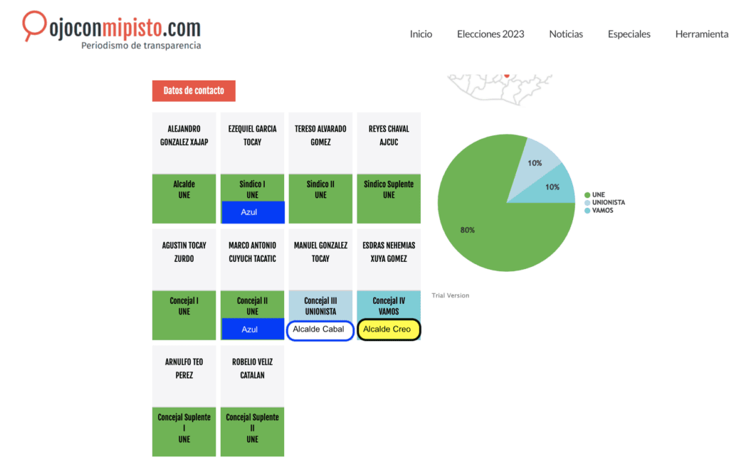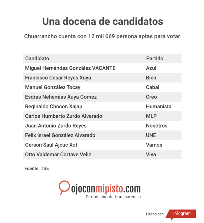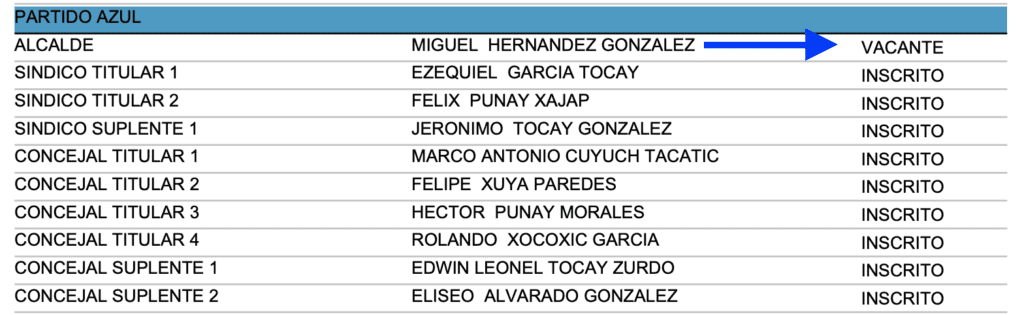 Chacón agregó que González apoya la planilla del partido Azul. Esta fue inscrita el pasado 23 de febrero encabezada por Miguel Hernández González, pero de acuerdo con el último informe de candidatos inscritos en el TSE su puesto aparece como vacante. Como primer concejal fue inscrito Marco Antonio Cuyuch Tacatic.