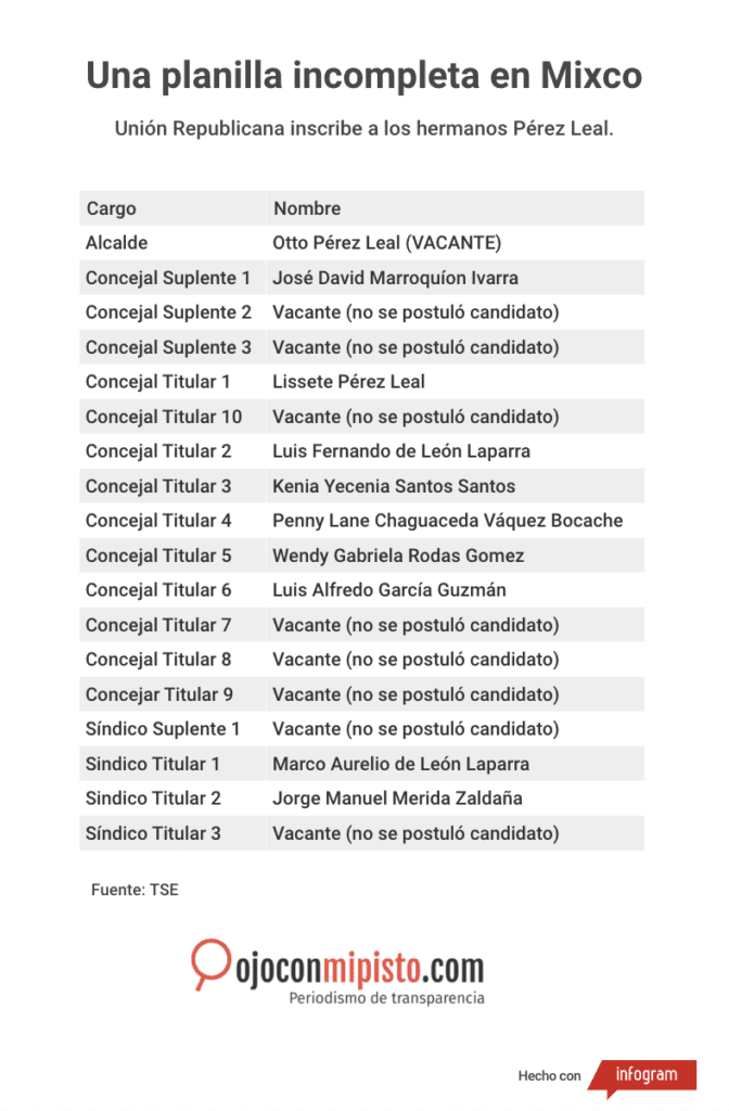 El Tribunal Supremo Electoral (TSE) está a la espera de una resolución definitiva que ordene inscribir a Otto Perez Leal como candidato a alcalde por el partido Unión Republicana en Mixco, Guatemala. La resolución de la Corte Suprema de Justicia es provisional.
