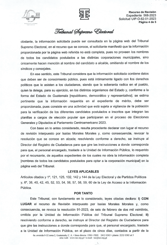 El Tribunal Supremo Electoral (TSE) dio con un lugar un recurso de revisión presentado por Ojoconmipisto. Con ello ordena al Registro de Ciudadanos entregar la información completa de las planillas de las distintas candidaturas a corporaciones municipales inscritas hasta la fecha para las elecciones de este año, cuyos datos están incompletos.