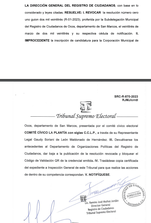 De acuerdo con la resolución SRC-R-870-2023, el Registro de Ciudadanos declara «improcedente la inscripción de candidatura para la Corporación Municipal de Ocós presentada por el comité cívico La Plantía».