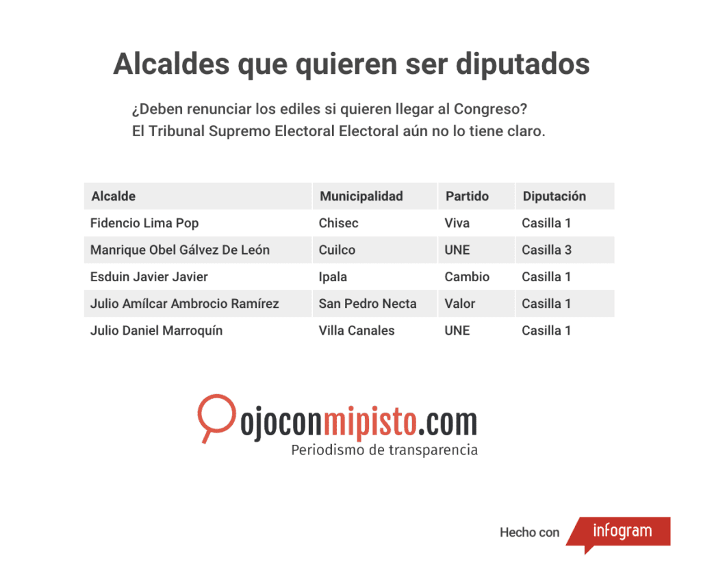 En 2017, el Departamento de Organizaciones Políticas concluyó que “los alcaldes no están obligados a renunciar tres meses antes de la convocatoria a elecciones para optar a los cargos de diputado”. La resolución de ese entonces coincide con la opinión del magistrado Gabriel Aguilera quien indicaque existen precedentes de las elecciones 2019: alcaldes fueron electos como diputados.