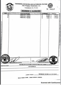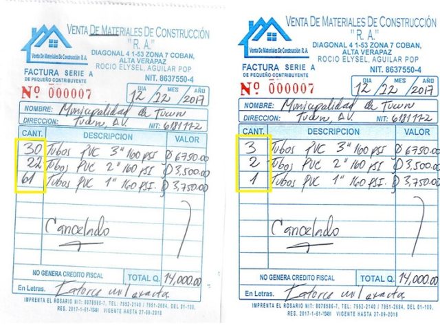 La municipalidad de San Miguel Tucurú, Alta Verapaz, dirigida por Leonel Victoriano Guzmán Argueta, pagó Q14 mil por comprar seis tubos PVC, según la factura serie A y número 000007 emitida el 12 de diciembre de 2017.